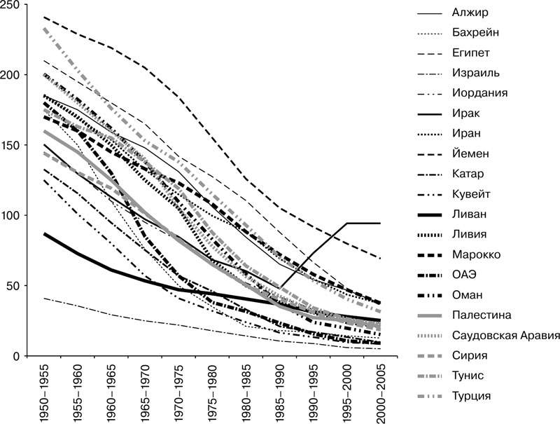 Рис. 2. Младенческая смертность в арабских странах и странах Ближнего Востока, на 1000 родившихся