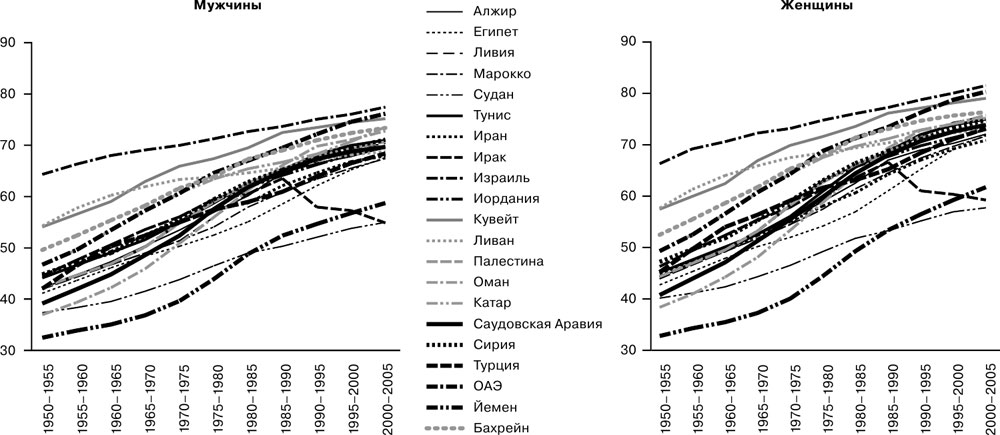 Рис. 3. Ожидаемая продолжительность жизни мужчин и женщин в арабских странах и странах Ближнего Востока, лет