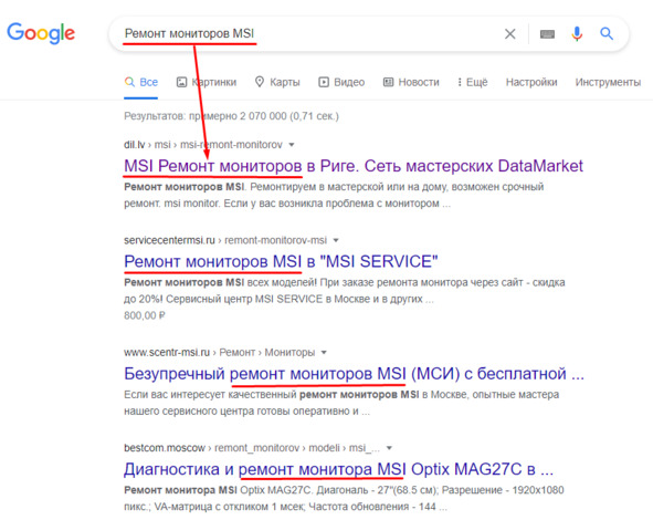 Доказательством того, что в результатах поиска можно обойти лидеров приведу доказательство: скриншот, на котором видно, что лидером может стать любой сайт. Даже обычная ремонтная мастерская электроники может обойти производителя товара.