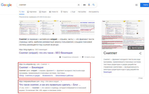 Обратите внимание, что на скриншоте в ответе на запрос пользователя в сниппетах только в одном заголовке, и в одном описании фигурирует слово диван.