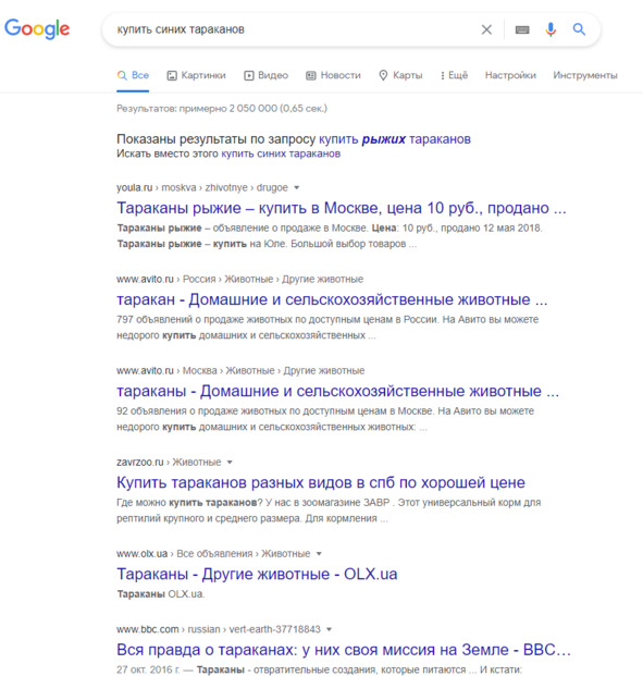 Как видите из выше приведённого скриншота на запрос «купить синих тараканов» Google как-бы предполагает, что человек ошибся, и выдаёт первый сниппет «купить рыжих тараканов», а далее разные заголовки про тараканов.