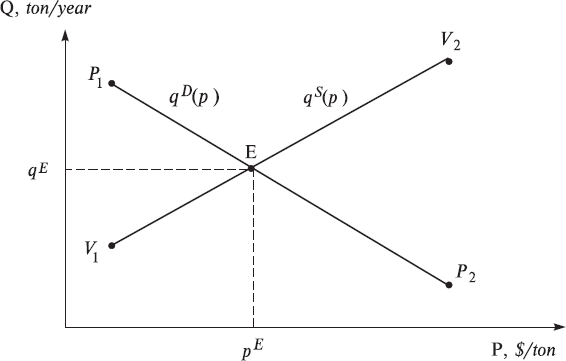 Let us note that each agent passes its plan to the chief in the form of table, and chief itself unites data of these plans and presents them in the easy-to-use shape of the two straight lines in one picture. Common sense tells us that it is most profitable for the buyer to purchase more at the minimum price. But in this scenario the seller would want to sell less. The opposite would be true for both buyer and seller at the maximum price. Graphically, this is reflected in the fact that when point P1 is higher than point V1, and the point V2 higher than point P2, the consequence is that the slope of the curve of the buyer is be negative, and the slope of the curve of the seller, positive. It is obvious that these two straight lines will compulsorily be crossed at the point E (pE, qE), where the prices and quantities of the buyer and seller coincide. Next, the chief considers that these prices and quantities reflect certain equilibrium in the market, he or she calls the equilibrium price and quantity and declares that these values of price and quantity are set for the market year. Market process is, in this case, further completely eliminated from market life, in that the decisions of the market's chief completely substitutes it during the next year. We call this model economy a quasi-market one, since plans are compiled by market agents. However, they realize them in the prices and the quantities that are essentially dictated by the market’s chief.