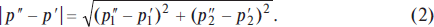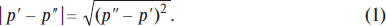 The distance between two points in one-dimensional space p' and p" can be for instance determined by the following: