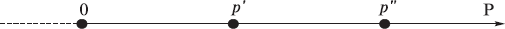 As we already discussed above, in order to show the movement or dynamics of an economy it is necessary to introduce a formal economic space in which this movement takes place. As an example of such space we can choose a formal price space designed by the analogy with a common physical space. We choose the prices Pi of the i-th item of goods as coordinate axes: i = 1, 2,…, L, where L is the number of items or goods (the bold P will designate below all the L price coordinates). In case there is only one good, the space is one-dimensional and represented by a single line. The coordinate system for the one-dimensional space is shown in Fig. 2.