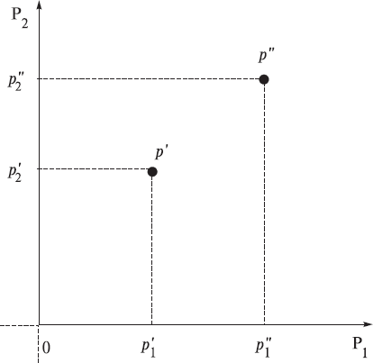 If two goods are traded on the market (L = 2), the space is a plane; the coordinate system is represented in this case by two mutually perpendicular lines (see Fig. 3).