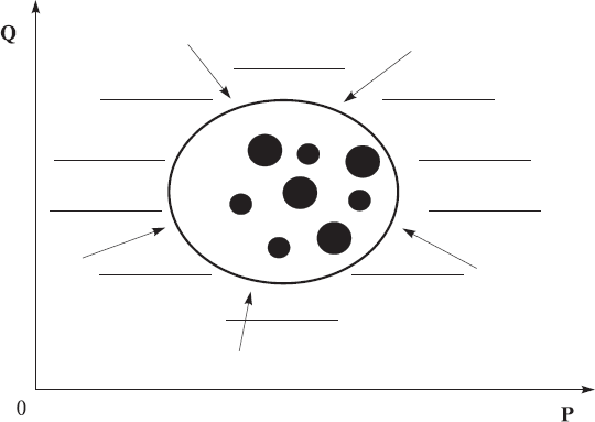 Fig. 1. Graphical model of an economy in the multi-dimensional PQ-space. It is displayed schematically in the conventional rectangular multi-dimensional coordinate system [P, Q] where P and Q designate all the agent price and quantity coordinate axes, respectively. Our model economy consists of the market and the external environment. The market consists of buyers (small dots) and sellers (big dots) covered by the conventional sphere. Very many people, institutions, as well as natural and other factors can represent the external environment (cross – hatched area behind the sphere) of the market which exerts perturbations on market agents, pictured here by arrows pointing from environment to market.