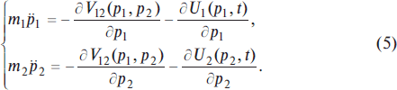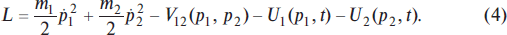 In (4) m1 and m2 are certain unknown constant values or parameters of economic agents who are the buyer and the seller respectively. The first two members of equation (4) in classical mechanics correspond to kinetic energy, and the remaining three to potential energy. Understanding the conventional character of these notions, we will use them for economy as well. Potential V12 (p1, p2) describes interaction between the buyer and the seller (it is unknown a priori), and potentials U1(p1, t) and U2(p2, t) are designed to describe environmental influence on economy. They are to be chosen with respect to experimental data according to the dynamics of the modeled economy. Lagrange equations have the following form for this type of Lagrangian: