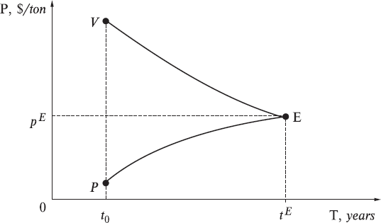 This system of two differential second-order equations of time t represents equations of motion for a selected classical economy. According to their form they are identical to the equations of motion of the physical prototype in physical space. In the latter system (5), the second Newton’s law of classical mechanics is designated: “product of mass by acceleration equals force”. And quite another matter is that potentials can be significantly different from the corresponding potentials in the physical system. We should mention once again that these potentials are to be discovered for different economies by detailed comparison of results of computation of equations of motion of economies with experimental or research data, or in other words, with data of empirical economics. At the initial stage it is natural to try to use known forms of potentials from physical theories, and we are going to do that in future. Let us note that the purchase-sale deal or transaction in the market between the buyer and the seller will take place at the time tE when their trajectories p1(tE) and p2(tE) intersect: p1(tE) = p2(tE) = pE, as it is shown in Figs. 2, 3 for the model grain market. The equilibrium value of price, pE, is indeed then the real price of the good or commodity in the market, what we refer to as the market price of the good. See formulas, figures and discussions for classical economies in Chapter I.
