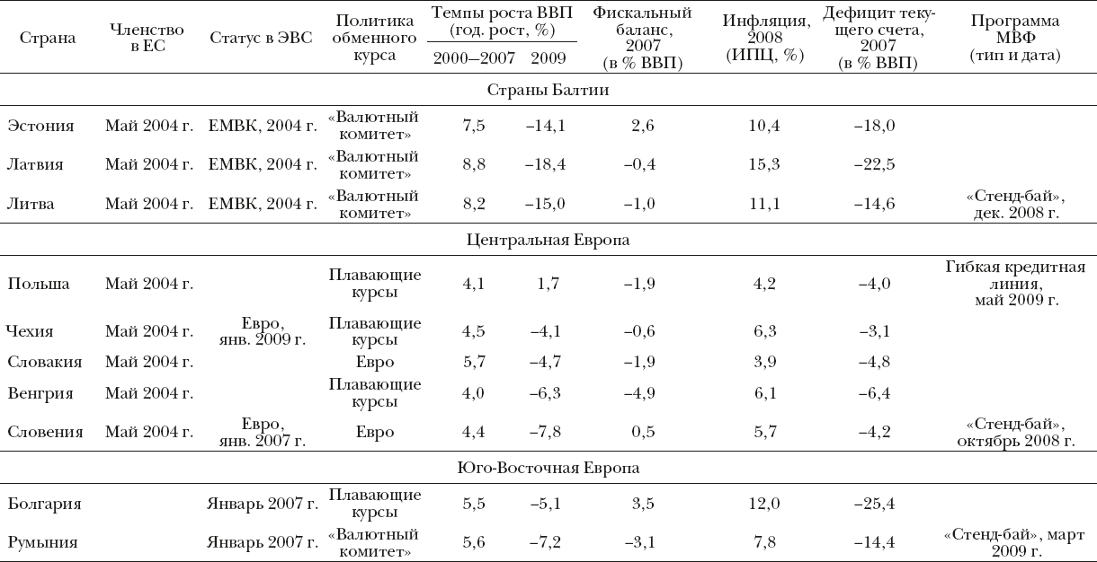 Три страны Балтии пострадали от кризиса больше других: в 2009 г. падение ВВП в этих странах составило от 14 до 18 %. Самым жестоким финансовый кризис был в Латвии, и Рига обратилась за помощью в МВФ. Страны, входившие в зону евро или имевшие плавающие курсы и проводившие разумную фискальную политику, выстояли. Больше всего повезло Польше, экономика которой показала в 2009 г. положительные темпы роста. Относительно неплохо дела обстояли в Словакии, Словении и Чехии. Венгрия и Румыния обратились за помощью МВФ, но причина была не в валютных курсах, а в сравнительно мягкой фискальной политике.