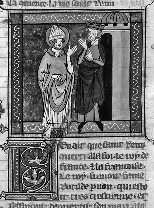Король Хлодвиг и святой Ремигий. Миниатюра из «Золотой легенды» Иакова Ворагинского. XIV в.