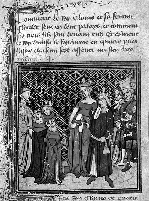 Король Хлодвиг и Клотильда Бургундская с детьми. Миниатюра из «Хроник Сен-Дени». XIV в.