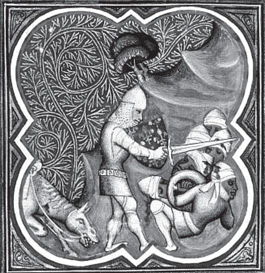 Сражение Карла Великого с сарацинами. Миниатюра Хроники Сен-Дени. XIV в.