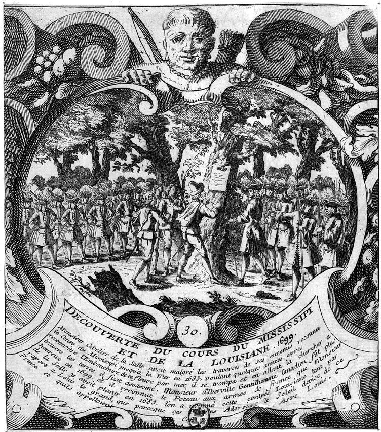 Освоение дельты Миссисипи и основание Луизианы Кавелье де Ла Салем в 1699 году. Гравюра начала XVIII века