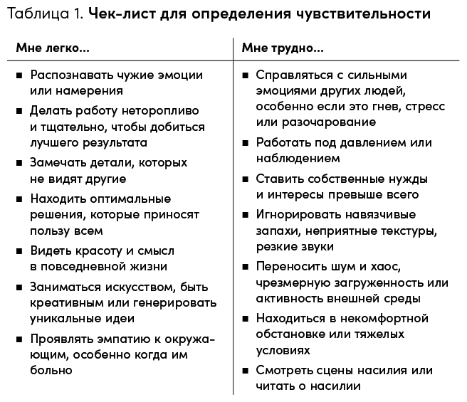 Помимо этого, вы можете самостоятельно оценить, что дается вам легко, а что с трудом. Если большинство утверждений, приведенных в таблице 1, относятся к вам, скорее всего, вы чувствительны.