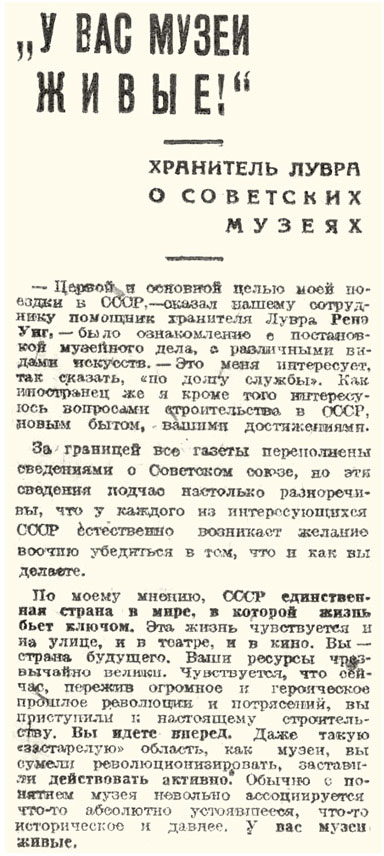 В интервью по следам московского визита Рене Юиг восхищался советскими музеями – и похоже, не совсем своими словами. Вечерняя Москва. 1932. 6 октября