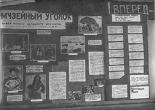 Стенд с репродукциями картин, статьями, справочной информацией о музеях Москвы и почтовым ящиком для обратной связи. Музейный уголок Государственного музея нового западного искусства в клубе завода «Каучук», 1930–1931. ГМИИ им. А. С. Пушкина