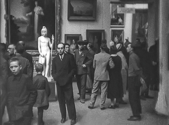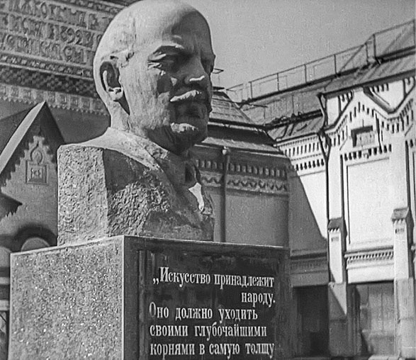 Ответом служил ленинский лозунг «Искусство принадлежит народу», выбитый на бюсте вождя, установленном у входа в галерею. В 1939 году бюст был заменен на памятник Сталину. «Москва глазами туриста» (реж. Эдуард Тиссэ, 1934). Кадры из фильма. РГАКФД