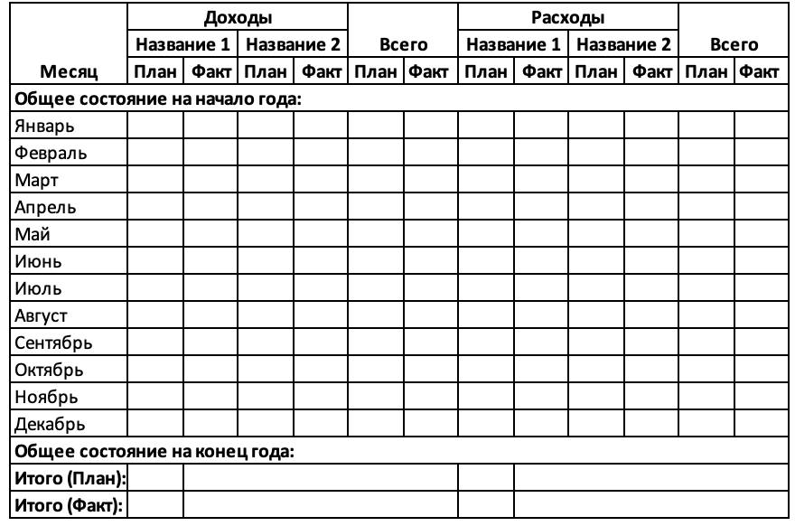 В качестве отправной точки рассмотрим вариант ведения бюджета с разбивкой по месяцам плановых и фактических доходов и расходов. В таблице ниже прилагаю вариант, в котором имеются «Название 1» и «Название 2», вместо которых будем вписывать типы наших затрат: