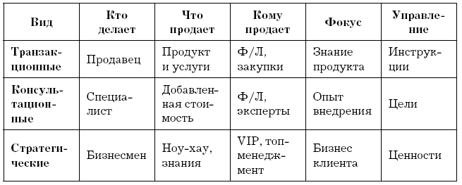 Смешанные типы продаж. Компаний, которые осуществляют только определенный тип продаж, например, только консультационные или транзакционные, мало. На рынке распространены смешанные типы продаж, что обеспечивает устойчивость компании-поставщика на рынке. Варианты смешанных типов продаж: консультационные + транзакционные, консультационные + стратегические.