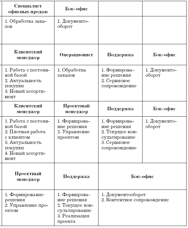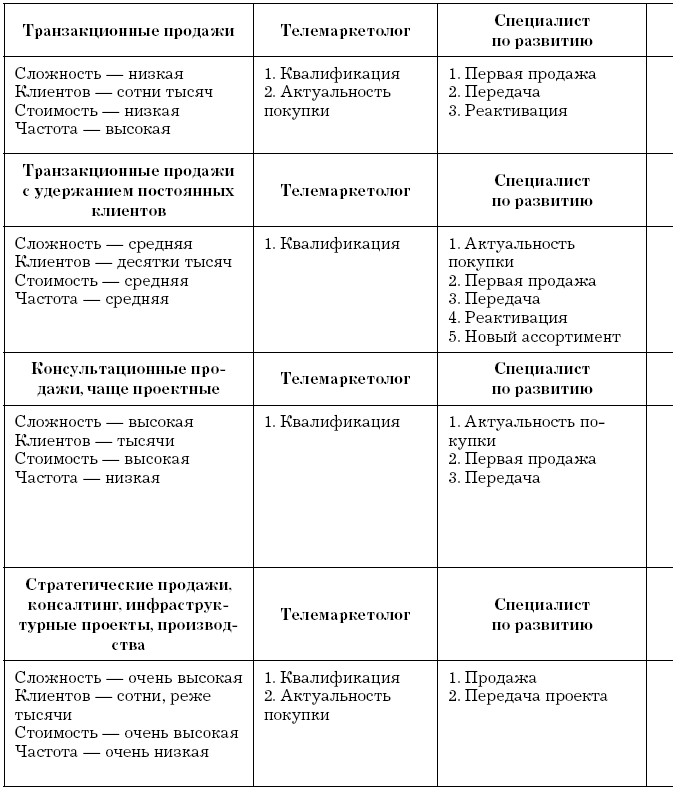 Сложно не заметить, что все структуры, отображенные в таблице 2, представляют собой конвейеры продаж с четким распределением функций. Сейчас уже не нужно доказывать эффективность такого подхода. Если и остались противники конвейеров продаж, то только по причинам невысокой компетенции в их организации. Основные сложности возникают с организацией поддержки всех типов продавцов, их материальной мотивацией, правильной загрузкой участников конвейера, перераспределением клиентской базы, условиями передачи клиентов по этапам конвейера, горизонтальным ростом сотрудников и нематериальной мотивацией. Решения этих вопросов достойны отдельной книги, и из-за ограничений по объему здесь мы их рассматривать не будем.