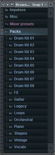 Теперь создадим партию ударных. Для этого нам нужно выбрать подходящие барабаны. Обращаемся в окошко слева (Браузер), там много папок, но нам нужна под названием Packs. В ней хранятся все инструменты, в основном ударные. Если вы хотите улучшить звучание, вам нужно будет добавить скачанную папку с новыми звуками (oneshot), чтобы добавить её в браузер зайдите в Options -> File Settings, и укажите путь до папки на вашем компьютере). Ван шоты (звуки) можно скачать и из интернета и добавить папку в браузер таким же способом.