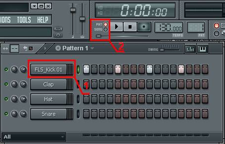 Обратите внимание, индикатор -2- должен быть в верхнем положении. Если он в верхнем положении (pat) – значит мы в своей «рабочей мастерской», и прослушиваем то что создаем в Секвенсоре. Если он в нижнем положении (song), проигрывается вся песня целиком. У нас она пока еще не готова.