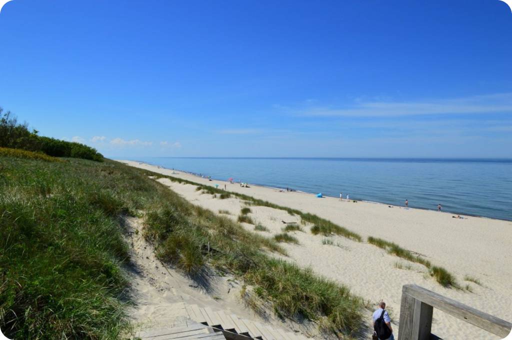 Напротив визит центра к морю уходит деревянный настил. Гуляя по нему, можно ознакомиться с необычной флорой Куршской косы, растущей прямо из песка дюн. Берег здесь высокий и обрывистый, поэтому можно насладиться видом моря с двух смотровых площадок. Или спуститься на широкий и чистый пляж. Здесь не так многолюдно, как на пляже возле променада в Лесном.