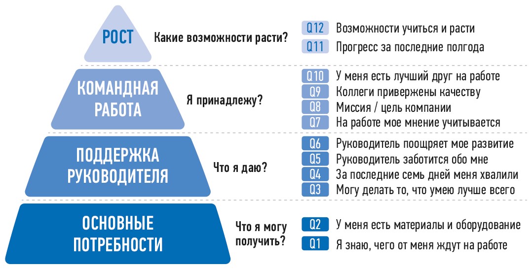 Институт Гэллапа на основе собственных исследований создал модель «Q12» – 12 вопросов персоналу, ответы на которые коррелируют с производительностью труда, лояльностью клиентов и ростом продаж. Среди них есть такие, как «Знаю ли я, что от меня ожидается на работе?», «Есть ли у меня на работе человек, который поощряет мой рост?», «Работает ли в моей компании один из моих лучших друзей?» и т. п.