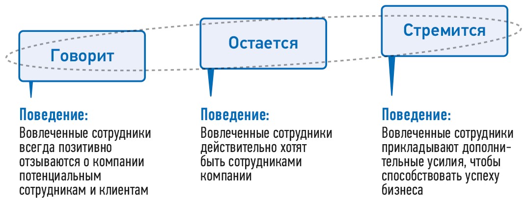 Компания Kincentric (ранее Hewitt Associates) использует опросник из 6 основных пунктов. Ее модель вовлеченности опирается на внешние индикаторы, поведение сотрудника: «говорит, остается, стремится» (say-stay-strive) (рис. 4).
