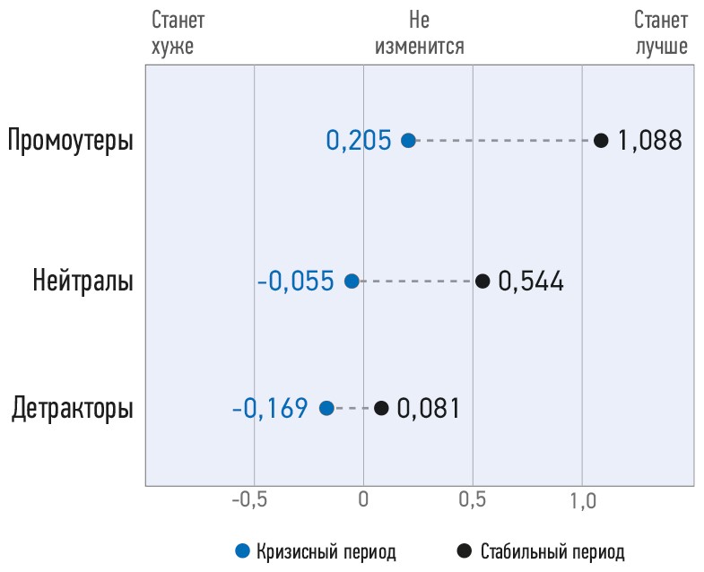 Нейтралы и детракторы же разочаровываются меньше: «Да, в нашей-то компании всякое может быть». Они изначально считают, что в компании есть проблемы, так что меняют свои взгляды в кризис гораздо меньше. И получается, что в период кризиса детракторы более стабильны, ведь они реалистично оценивают ограничения компании. А промоутеры теряют часть оптимизма.