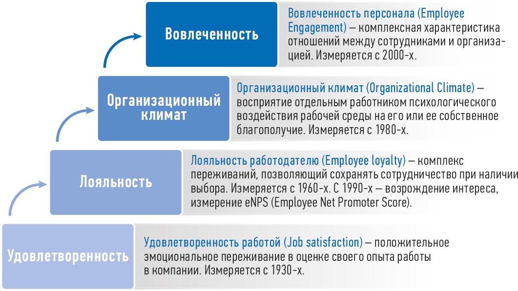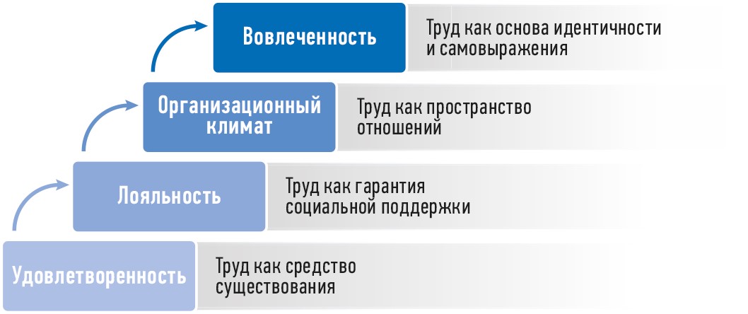 Интересно, что некоторые компании до сих пор смешивают изучение вовлеченности и организационного климата. Они называют такую работу изучением социально-психологического климата, но на самом деле изучают именно вовлеченность. Можно сказать, что они уже перешли на следующую ступень, но не до конца осознали это (рис. 6).