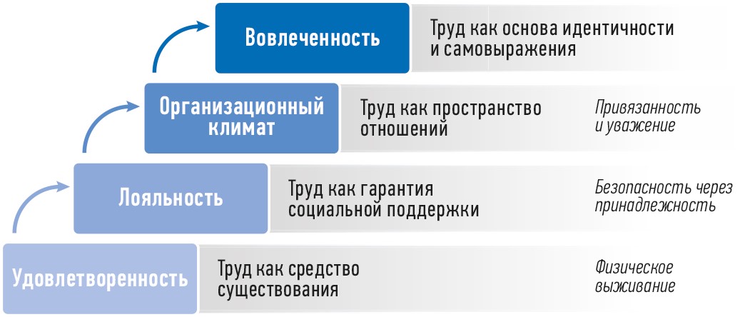 Развитие бизнес-среды или компании означает и изменение ожиданий от труда ее сотрудников. Этот процесс тоже можно представить как эволюционную лестницу. На нижней ступени труд воспринимается как средство существования, на более высоких – как гарантия социальной поддержки, пространство отношений, основа идентичности и самовыражения. Каждой ступени соответствует собственный, наиболее эффективный подход к управлению состоянием персонала – от удовлетворенности до вовлеченности (рис. 7).