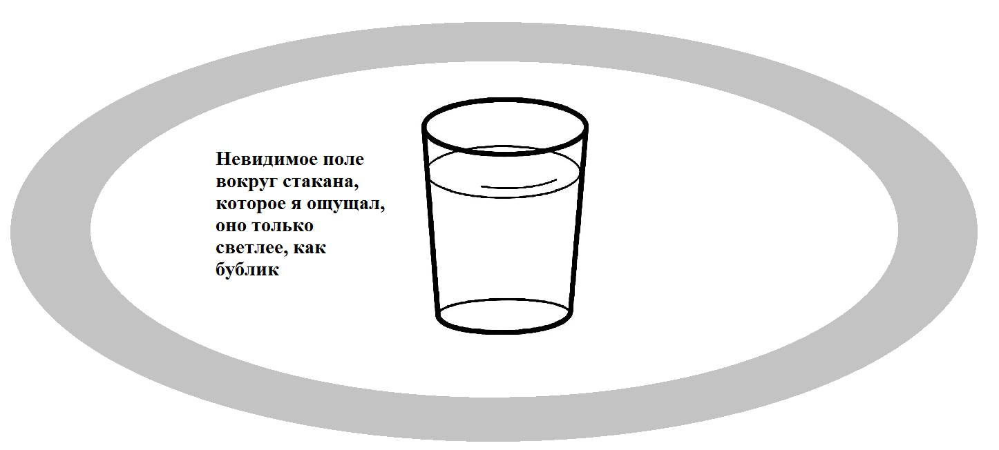 Поле было вокруг стакана, оно как бы белое, его не видно глазом, я его не видел, но чувствовал каким-то не известным мне чувством, что оно белое. Я не поверил собственному ощущению, убрал руку, но потом поднёс снова руку к стакану, поле оставалось на месте, я обвёл рукой вокруг стакана, поле было вокруг. Я думаю это просто стоячие волны, от вращающихся молекул стекла. Я это ощущал.