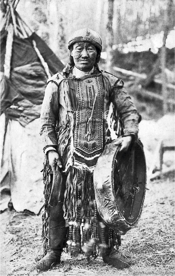 Тунгусский (эвенкийский) шаман Николай Камбагир в своем облачении перед камланием. 1926 год