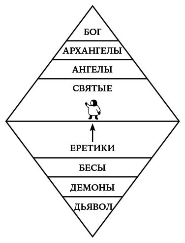 Получилась четкая замкнутая фигура, которая разделена в середине линией и строго симметрична, поскольку является отражением двух равных треугольников, которые зеркально повторяют друг друга, являя образ мышления при помощи бинарных оппозиций. Помните картинку из школьного учебника, где изображена пирамида власти: король, графы, бароны, простолюдины? Треугольники, половинки ромба, в картине мира – нечто подобное, но с другими персонажами. Две его вершины воплощают предельные образы добра и зла, света и тьмы – Бога и его антипода – дьявола; вниз и вверх от них идут: под Богом – архангелы, над дьяволом – главные помощники – демоны; далее – ангелы, которым в противоположном треугольнике соответствуют бесы; потом святые и праведники и соответственно их противоположности – заблудшие грешники, отступники, еретики, ведьмы, другие пехотинцы Сатаны. В середине – человек, находящийся между добром и злом, он имеет завет с Богом и должен противостоять дьяволу, но первородный грех и многие приобретенные в жизни грехи связывают его и с силами тьмы. Именно поэтому человек всегда между: нарушая завет, он становится на сторону зла, а подтверждая завет в ритуале – стремится к Богу. Ему необходимо замолить, оправдать свои проступки, чтобы вновь вернуться в лоно своего Бога. Дьявол – сторона атакующая, у дьявола нет завета с обществом, поэтому он так неистово стремится заключить свой договор с грешниками. Свой собственный завет нужен ему, чтобы уравновесить отношения с социумом, стать равноправным с Богом. Именно за души людей идет спор – постоянная борьба добра со злом. Стороны равны, поскольку человек тоже бинарен, он, как и ромб, состоит из двух частей – духа, тяготеющего к Богу, и тленного тела, которое слабо и подвержено соблазнам дьявола, и это тоже определенный закон – установка и завет Бога-Творца, который Сам создал мир и человека именно такими.