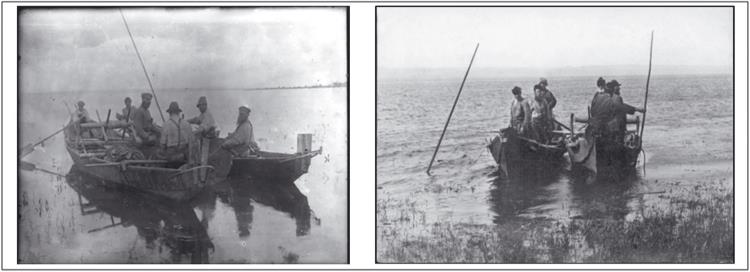 На фотографии видно, что группа работников состоит из трех человек: руководителя работ (в центре), работника, непосредственно измеряющего глубину (справа), и работника, записывающего значения измеренной глубины (слева). Обратите внимание на высокий шест, находящийся за спиной второго работника. Он поставлен специально для того, чтобы с берега можно было заметить и зафиксировать место на акватории, в которой измерялась глубина.