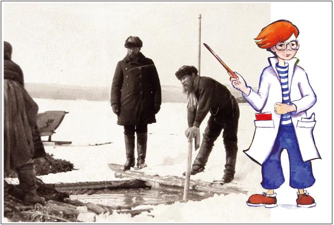 Рис. 3.2. Измерение глубин шестом со льда в Карелии.
