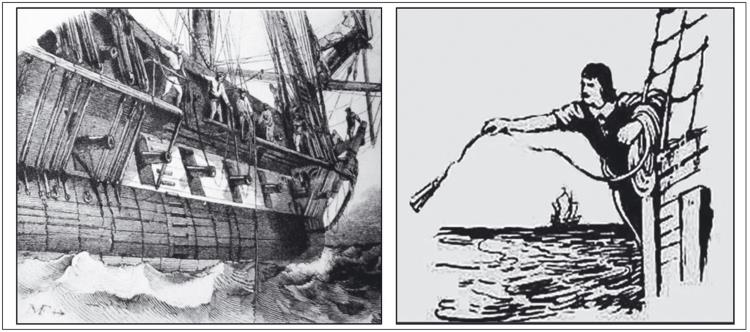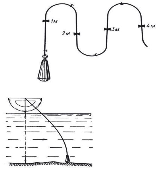 На больших глубинах, далеко от берега, для измерения использовали простой, но очень надежный прибор – ручной лот. Это длинная веревка с грузом на конце и завязанными через равные промежутки узлами. Чем больше вытравлено веревки, тем глубже. Узлы были особым образом помечены, что позволяло записать значение измеренной глубины. Использование ручного лота позволяло измерить глубины на десятки метров, что обеспечивало безопасное плавание любых надводных судов.