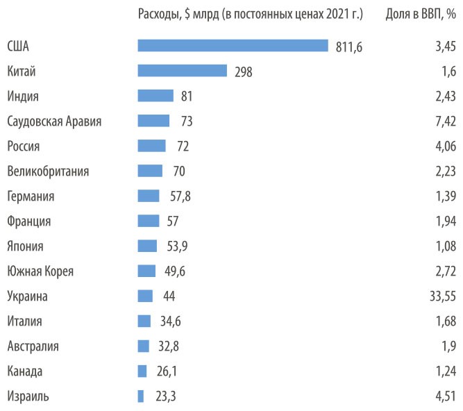В пятерку лидеров по расходам вошли США, Китай, Индия, Саудовская Аравия и Россия – в сумме их траты составили 63 % от общемировых[22].