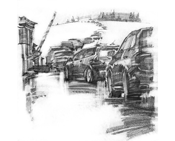 Пропускной пункт. Небольшая очередь из трех машин. Перед нами – синяя вольво. До верха забита какими-то шмотками. Присмотревшись, обнаруживаем, что это одеяла, подушки, зимняя одежда, что-то там еще, все это – видимо для мальчишки, примерно одного с Данькой возраста, сидящего на пассажирском сидении, рядом с напряженно вцепившейся в руль женщиной – похоже его матерью. Паренька, очевидно, везут на учебу, и тоже, скорее всего, раньше ожидаемого.
