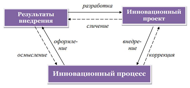 В реальной практике эти этапы взаимодействуют, образуя непрерывный цикл. Например, в ходе внедрения инновационного проекта происходит корректировка и доработка самого проекта. При оформлении результатов внедрения осмысляются реализованные инновационные процессы, а полученные знания учитываются при разработке новых инновационных проектов.
