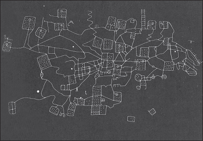 Today, the oldest so-called maps look like little more than a few carved scratches, their meaning lost with the civilizations that created them. About four thousand years ago, craftsmen near the present-day village of Bedolina, some ten thousand feet high in the Italian Alps, set about carving the rock with rough bronze or iron tools. They drew pictures of animals, daggers, and suns, much as their cavemen ancestors elsewhere in Europe had done ten thousand years earlier. But the artists of Bedolina also produced one of the first known maps. The Mappa di Bedolina is approximately four yards wide and six yards high, an ambitious patchwork of carved lines and symbols, with a series of crudely drawn rectangles, most of them filled with carefully spaced dots and linked with snaking irregular lines. They seem to represent fields with paths, rivers, or irrigation canals running between them – a graphic illustration of a cultivated landscape in the Valley of Valcamonica below. Their carvings could have had some religious or magical purpose, but after four millennia, we can only guess at what it might have been. Armed figures, huts, and shapes like ladders were added to the map hundreds of years afterward, maybe adapting it for new mystical or ceremonial rites in a mixture of religious faith and straightforward observation that was to characterize mapmaking through the ages.