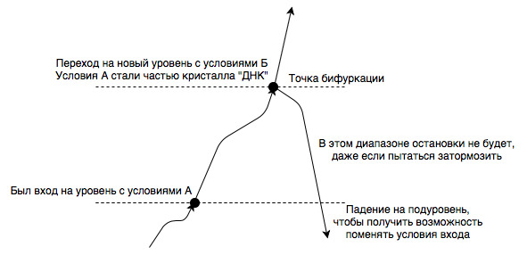 если система вошла на новый уровень Сознания с параметрами, которые не позволили этот уровень превзойти, она распадётся на подсистемы более низкого уровня, давая возможность случайным событиям пересобрать условия входа в новую, более удачную конфигурацию.
