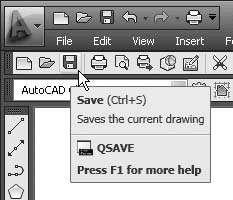 Панели инструментов являются графическим интерфейсом команд программы AutoCAD, то есть выполняют соответствующие им функции. О назначении кнопки вы можете узнать, подведя к ней указатель мыши. При этом появится всплывающая подсказка с кратким описанием кнопки. Если для команды назначено сочетание клавиш, оно также будет показано во всплывающей подсказке. На рис. 1.9 представлена панель инструментов Standard (Стандартная) с указателем мыши, подведенным к кнопке Save (Сохранить).