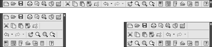 Панели инструментов могут быть закрепленными (в таком состоянии они отображаются по умолчанию) и плавающими. Название плавающей панели инструментов можно увидеть в подсказке, появляющейся при наведении указателя мыши на панель. Для закрытия плавающей панели инструментов предназначена кнопка с крестиком, расположенная в ее правой части. Кнопки плавающей панели инструментов могут располагаться как в один ряд, так и в несколько. Чтобы сделать панель плавающей, достаточно перетащить ее с помощью мыши на некоторое расстояние от края графического экрана. На рис. 1.11 показана плавающая панель инструментов Standard (Стандартная) с различным расположением кнопок.