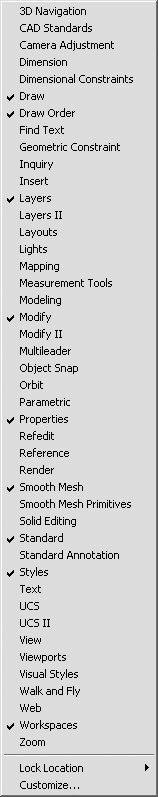 Всего в AutoCAD 2010 имеется 44 панели инструментов. Чтобы отобразить или скрыть какую-либо панель инструментов, щелкните на любой из них правой кнопкой мыши. На экране появится меню, содержащее список доступных панелей (рис. 1.12).