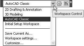 • Workspaces (Рабочие пространства) (рис. 1.14) – служит для переключения между рабочими пространствами программы AutoCAD 2010: 2D Drafting & Annotation (Двухмерное черчение и аннотирование), 3D Modeling (Трехмерное моделирование), AutoCAD Classic (Классический AutoCAD) и Initial Setup Workspace (Начальное установочное рабочее пространство).