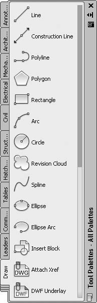 Чтобы вызвать инструментальную палитру, выполните команду ленты View → Palettes → Tool Palettes (Вид → Палитры → Инструментальные палитры). На инструментальной палитре содержатся кнопки вызова инструментов, сгруппированные по их функциональному назначению на множестве вкладок (рис. 1.15).