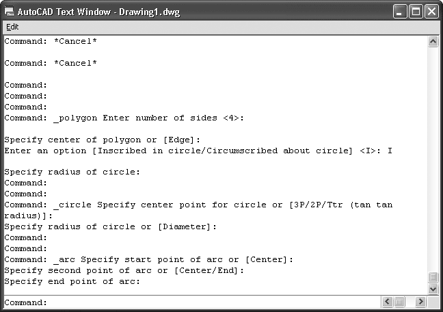 Командная строка хранит историю введенных команд. Однако, поскольку область команд занимает две строки, просмотр истории затруднителен. Вы можете увеличить размер командной строки, но это уменьшит графическую область, что очень неудобно. Для решения данной проблемы в программе AutoCAD предусмотрено отображение области команд в отдельном окне. Если вам нужно просмотреть историю команд, нажмите клавишу F2, и на экране появится окно AutoCAD Text Window (Текстовое окно AutoCAD) с необходимой информацией (рис. 1.17). Чтобы убрать его, нажмите еще раз клавишу F2.