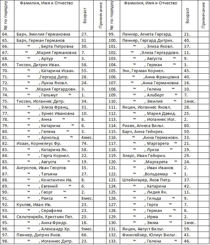 В условиях начавшегося голода Продовольственный комитет Немцев Поволжья и его подведомственные сети проводят в январе 1922 года перепись населения. Со списком проживавших в колонии Ам Тракт семей можно ознакомиться в главе Именной список на январь 1922 года. Кёппентальский район на момент переписи включал в себя меннонитские селения Ам Тракт, не меннонитским был хутор Ново-Привальное (Ной-Варенбург), который с 1922 года также получал продовольствие по линии Американской меннонитской помощи (АМП). Отмечу, что если кто-то в списках ищет своих родных 1920-го начала 1921-го гг. рождения, то их в списках может не быть. Поскольку младенческая смертность была высокой, то младенцев зачастую не записывали. Часть населения к переписи 1922 года была уже расстреляна в ходе Красного террора (смотрите «Дело №24 по обвинению Тиссен Франца Ивановича и др. 62 человек от 19 мая 1921 года» в сборнике «Ам Тракт. Материалы по колонии меннонитов»), некоторые члены семьи могли умереть от голода после потери кормильца и изъятия средств к существованию и всего имущества. Всего по стране от голода, только к весне 1922 года умерло более 5.000.000 человек (данные из официальной кинохроники тех лет).